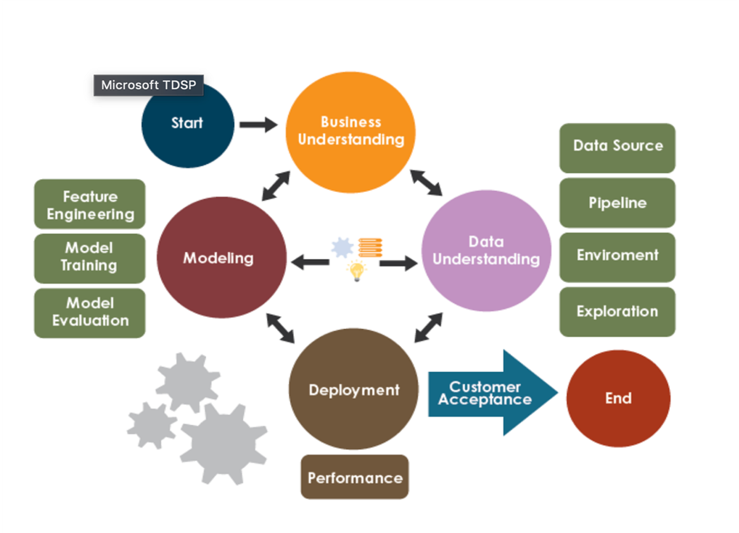 Team Data Science Process (TDSP) is a modern, agile framework created by Microsoft for collaborative, team-based data science projects in enterprise settings. Combining aspects of Scrum and CRISP-DM yields a process like Microsoft’s Team Data Science Process. Introduced in 2016, TDSP is described as “an agile, iterative data science methodology to deliver predictive analytics solutions and intelligent applications efficiently.” The approach is more streamlined, using five phases instead of eight compared to CRISP-DM. [3]